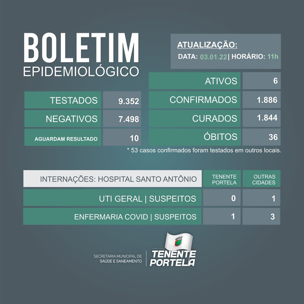 Boletim Covid-19 de Tenente Portela desta segunda-feiraPortela Online3 de jan. de 20220 min de leituraAvaliado com NaN de 5 estrelas. Assessoria de Comunicação | Prefeitura de Tenente Portela
