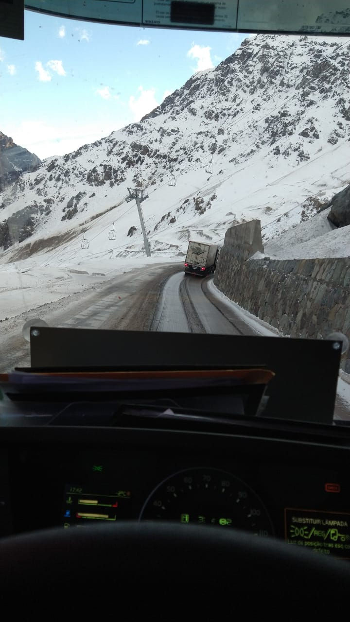 “Estamos aqui em Los Andes esperando a forte nevasca passar, segundo relatos que até quarta-feira libera,mas é difícil, tem muitos caminhões lá em cima parados a neve está 2 metros de altura.